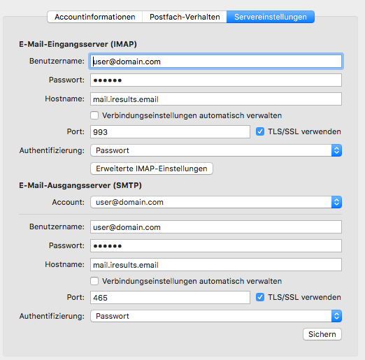 Verwenden Sie die folgenden Einstellungen für die Konfiguration Ihres E-Mail Programm: